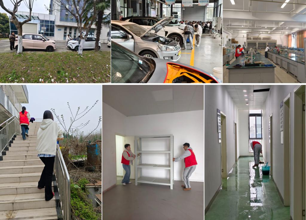 活动中,志愿者们身着统一志愿服装,分区域开展清洁工作:在学院污水处理厂,大家手持工具对厂区实验楼护栏、绿化带及卫生间进行“拉网式”清理,细致排查隐蔽角落,为环境“美颜”;在汽车实训室,志愿者们分工擦拭实训设备、清扫地面并开展通风消毒,保障后续实训顺利开展;在轻工楼和综合楼实验室,大家分组擦拭实验台面、清理试剂残留、清扫卫生死角并为仪器除尘养护,严格遵守安全规定,确保清洁工作有序高效。
