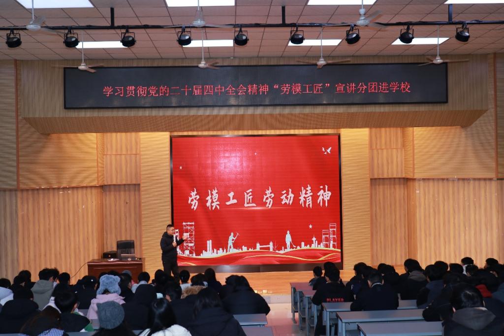 为深入学习贯彻党的二十届四中全会精神及大力弘扬劳模精神、劳动精神、工匠精神,引领青年学生坚定理想信念、砥砺奋斗品格。1月9日,由都江堰市总工会主办双碳学院承办的学习贯彻党的二十届四中全会精神“劳模工匠”宣讲分团进校园专题讲座活动在多功能一厅隆重举行。活动特邀“成都市工匠”获得者、成都市技术能手、成都市产业教授(导师)刘裕大师来校,为师生带来一场深刻而生动的主题讲座。200余名师生代表现场聆听讲座,并与刘裕大师进行了面对面交流。